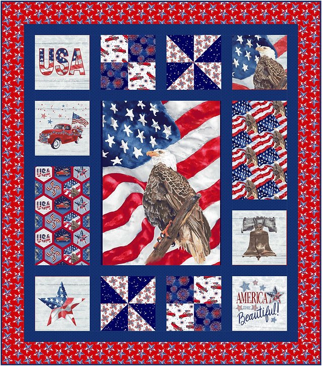 The Boxed In – Wings of Freedom quilt, designed by Kari Nichols for Quilting Renditions, is a stunning tribute to American pride. Showcasing a bold bald eagle panel surrounded by a rich blend of red, white, and blue fabrics, this patriotic-themed quilt makes a powerful statement. The finished size is 58.5" x 68.5", making it a striking and meaningful addition to any space.