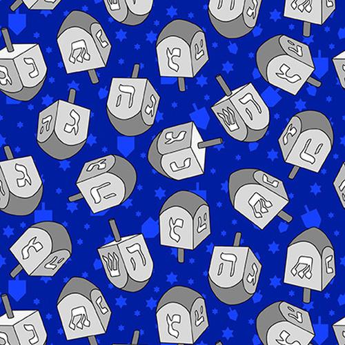 Print Description: A print of grey dreidels on a dark blue background.