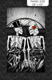 'Till Death Us Do Part is where Gothic romance meets edgy design—with a playful twist! Imagine what happens when Ed Hardy style collides with Halloween, dark humor, and Northcott’s signature touch. Designed by Deborah Edwards, this unique collection was inspired by trending Halloween home décor featuring black-and-white skeletons, tattoo motifs, love potions, and gothic charm.
