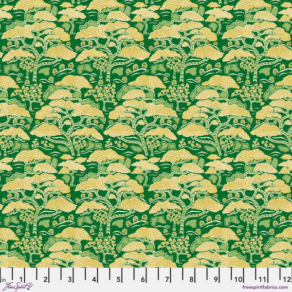 Print Description: This print features bonsai trees & gingko plants in yellow on a green background.