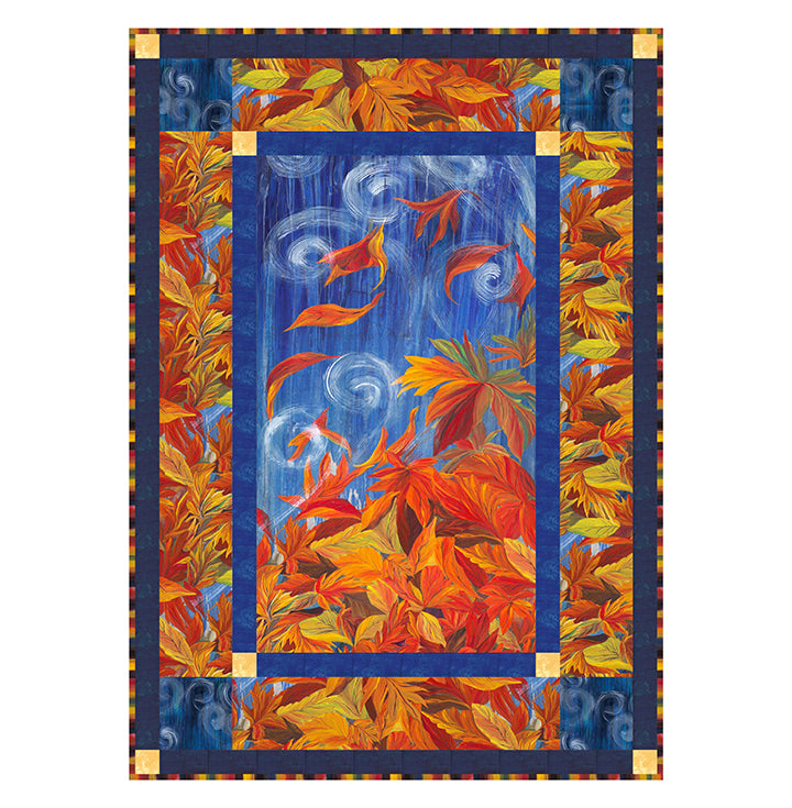 The Wild Night kit incorporates fabrics from the Wild Night line of fabric by Northcott. Its finished size is approximately 42"x61". Each kit includes instructions, a 24" x 43" panel, and fabric to complete the quilt top and binding. Backing is not included.