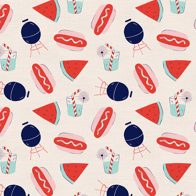 Print Description: Hot dogs , watermelon ,Grills and drinks in patriotic colors