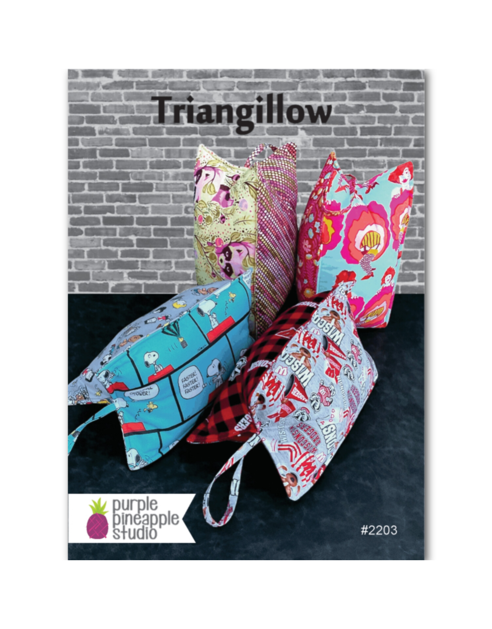 Description: Triangillow #2203 Pillow Pattern from Purple Pineapple Studio. This folded hard copy pattern is made of sturdy card-stock and is the size of a 5" x 7" postcard. The finished pillow will measure appr. 8" x 13". 3 FQs OR 1/4 yd of three complimentary fabrics (3) 8" x 14" pieces of thin batting. Fiberfill or polyester stuffing.