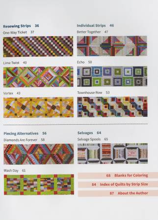Description: Go beyond the expected with strip quilting's best-kept secrets! Learn tips for cutting, storing, and piecing fabric strips in a variety of widths. Sewing easy strip sets to start, you'll advance to triangles and interesting layouts that might surprise you. Then make the most of your stash by turning pre-cut strips, sliced yardage, and selvages into 15 innovative strip-quilt projects. Customize each quilt with blank coloring pages, laying the foundation to design your own strip quilts.