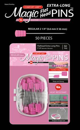Comfort Grip, Heat Resistant, 50pc. Taylor Seville Originals Notions make your sewing life easier. The Comfort Grip Magic Pins Flat Head Extra Fine are 0.6mm. They have a comfort grip flat head that makes picking up and maintaining a grip on the pin, easy. These are strong and sharp pins which are ideal for multiple layers of fabric. The Comfort Grip Flat Head Magic Pins are also heat resistant, so if you iron over them, they will not be ruined. The pins come in a designer storage case that closes, so you won’t lose any pins!