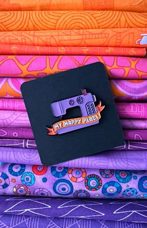 This 2" wide pin features a hand-drawn lavender sewing machine, highlighted with an orange banner that reads “My Happy Place” across the bottom.