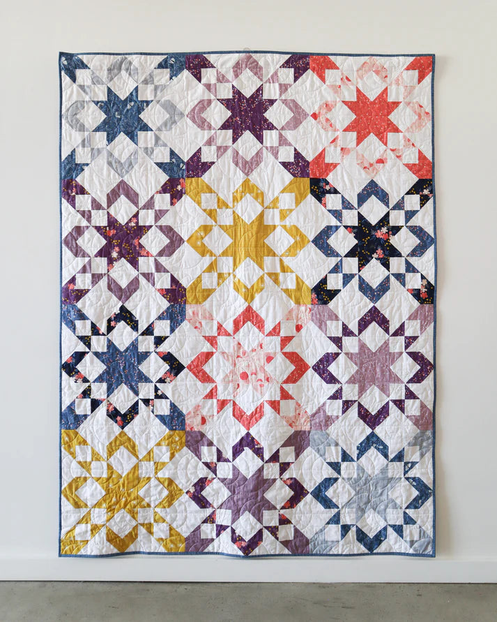 Description:   The Starly quilt pattern combines modern and classic quilt patterns for an eye-catching look. The classic sawtooth star block pattern is wreathed, creating a secondary design that adds a touch of modernity and a distinctive aesthetic.