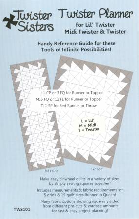 Plan your own twister quilt with this handy reference guide for the Lil' Twister, Midi Twister and Twister tools. This planner includes measurements and fabric requirements for 5 grids and 15 quilt sizes, from runner to queen. Use the guide to determine how to use fabric pre-cuts and/or yardage for fast and easy project planning and kitting. Ifi you are unfamiliar with how these amazing tools are used to make fun and easy pinwheel quitls by simply sewing squares together, check out the demo under the Lil' Twister Tool (LILTWISTER).