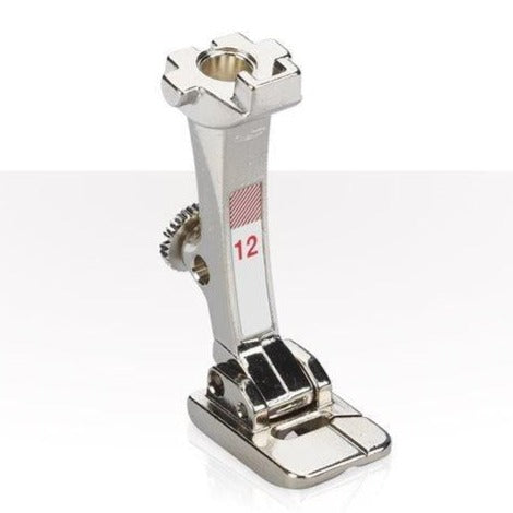 The BERNINA Bulky Overlock Foot #12 has a wide groove in the sole, making it ideal for sewing bulky knitted fabrics or for attaching leather strips. One side of the sole is longer than the other, allowing even thick and uneven fabrics to travel under it smoothly. The presser foot also has a guide hole for sewing over piping cord.