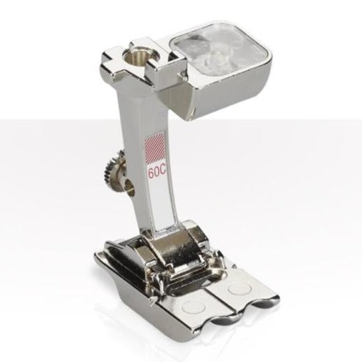 Description: Double Cord Foot #60C allows the simultaneous couching of two parallel cords 7 to 8 mm in diameter.