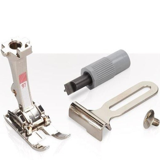 Description: #97 Patchwork Foot. The patchwork specialist for a 9 mm stitch width. For patchwork projects with seam allowances of 3 mm (1⁄8”), 6 mm (¼”) and 7.5 mm (1/3“). Three notches on the side for precise guidance. For 9 mm machines.