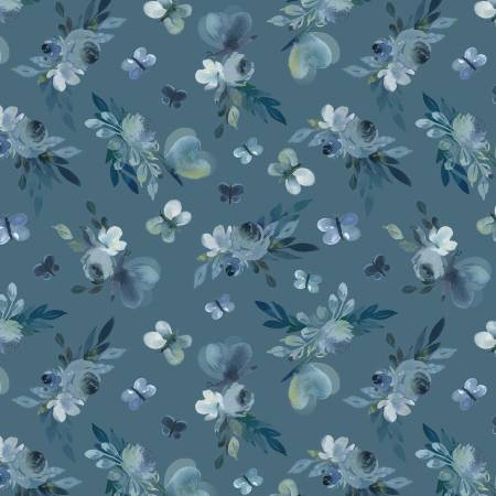 Print Description: A delicate watercolor floral and butterfly pattern on a dark blue background. The flowers and butterflies are in shades of blue, green, and white.
