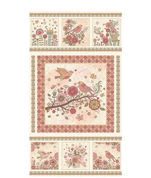 This charming panel features a whimsical design of birds and flowers. It includes one large square, measuring approximately 18.5" x 18.5", along with six smaller blocks, each around 7.5" x 7.5". The entire panel measures 24" x 44".