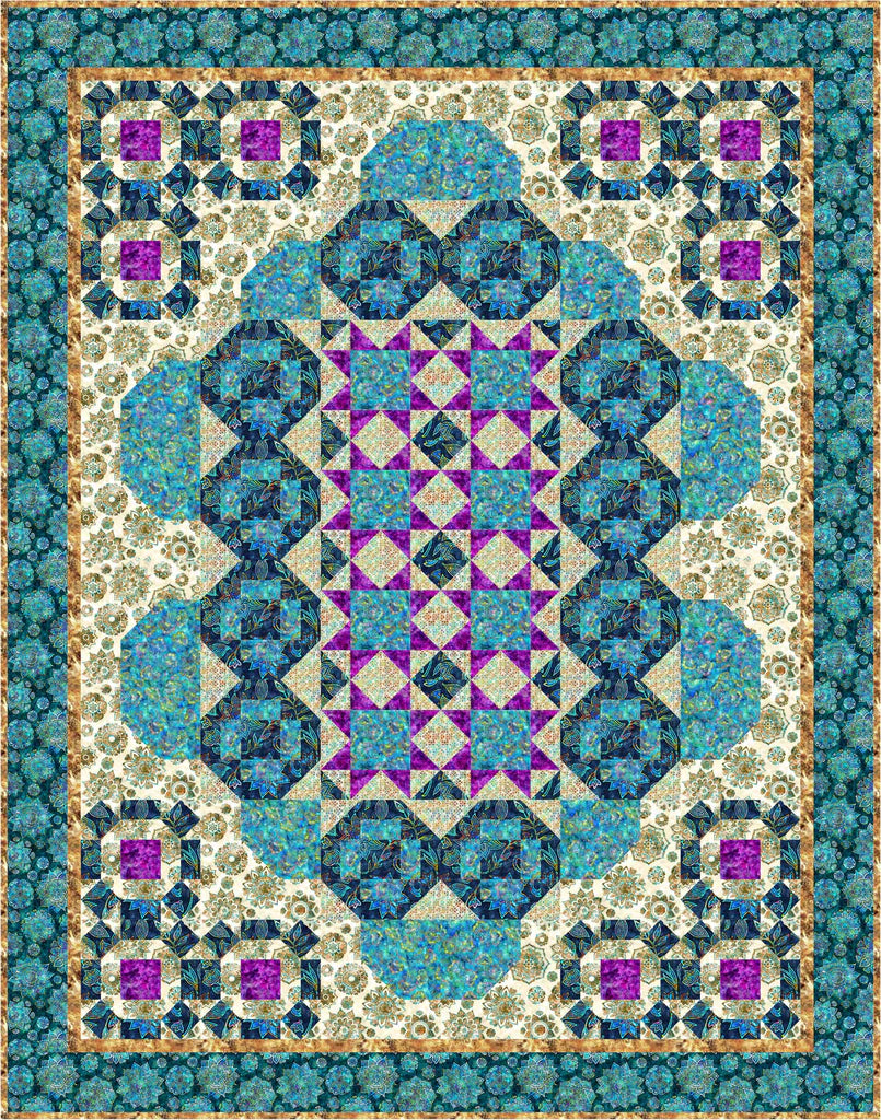 Description: The layout of this quilt makes you think of a Persian carpet - great for any bright or international print. Image sample is made from QT fabrics Kashmir collection. Finished size 65" x 83".