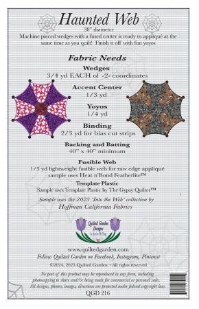 Collection Description: 38" diameter (excluding yoyos). A perfect weekend project for the season of ghouls and goblins. Template cut wedges piece together easily. The perfectly placed center is machine appliquéd during the quilting stage. Finish off the fun with bias cut binding and the ever popular yoyos. Thorough directions, templates and diagrams are included