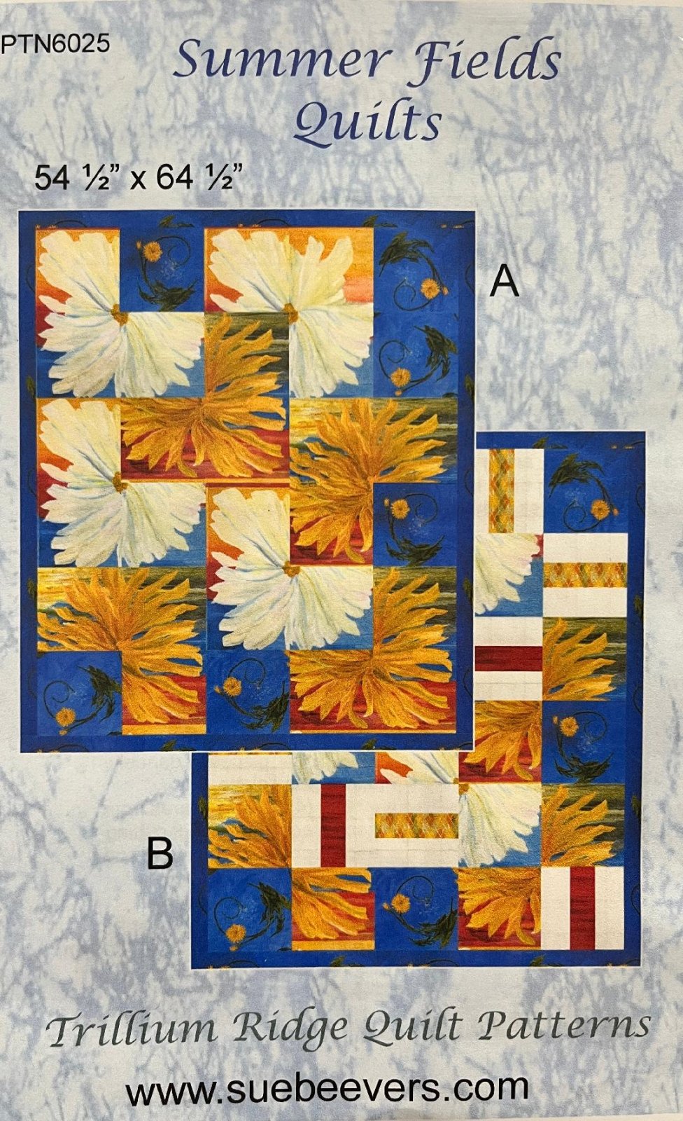 Description: Summer Fields Quilts Pattern by Sue Beevers, Trillium Ridge Quilt Patterns. Includes directions for two quilt variations both sizes are 54.5 x 64.5". Pattern features the Dandelions and Daisies fabric line by Stephanie Brandenburg of Frond Design Studios, Northcott Fabrics.