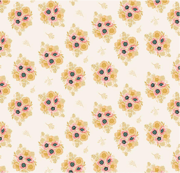 Print Description: This print features scattered clusters of flowers and sprigs of leaves.
