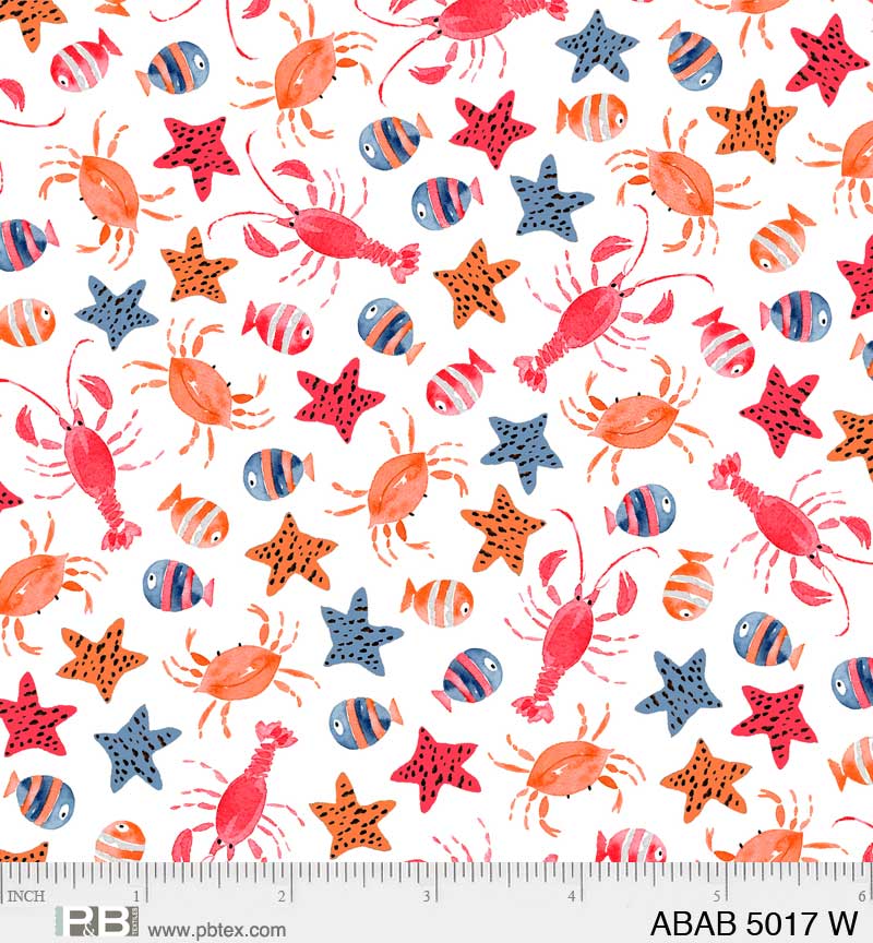 Print Description: This print features lobsters, starfish, fish, and crabs tossed on a white background.