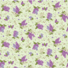 Print Description: This print features small Lilac flowers and butterflies tossed on a green background.