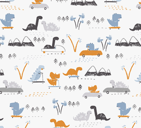 Collection Description: Fossil Folks by Figo Fabrics is a delightful collection that brings prehistoric charm to life! Designed by Jillian Phillips, this whimsical line features adorable dinosaur characters paired with soft, floral-inspired motifs, creating a playful yet gentle aesthetic.