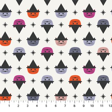 Print Description: This print features multi-colored cat heads wearing black witches hats on a white background.