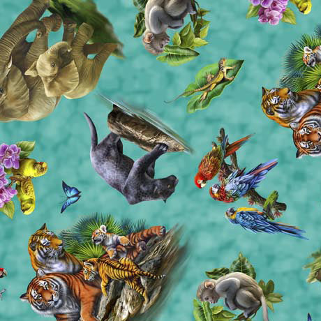 Collection Description: Bring the beauty of the jungle to your next project! Majestic animals and jungle flora in lush, vibrant color are center stage in this versatile collection. A large panel, picture blocks, and an allover scenic offer endless options for your safari themed sewing adventure!