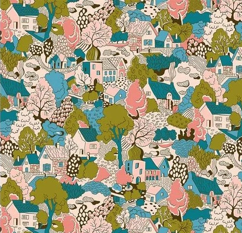 Print Description: Pink and blue houses with different color trees.