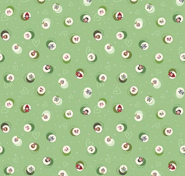 Print Description: This print features dots with characters and elements from Little Red Riding Hood on a background with dots and hearts.