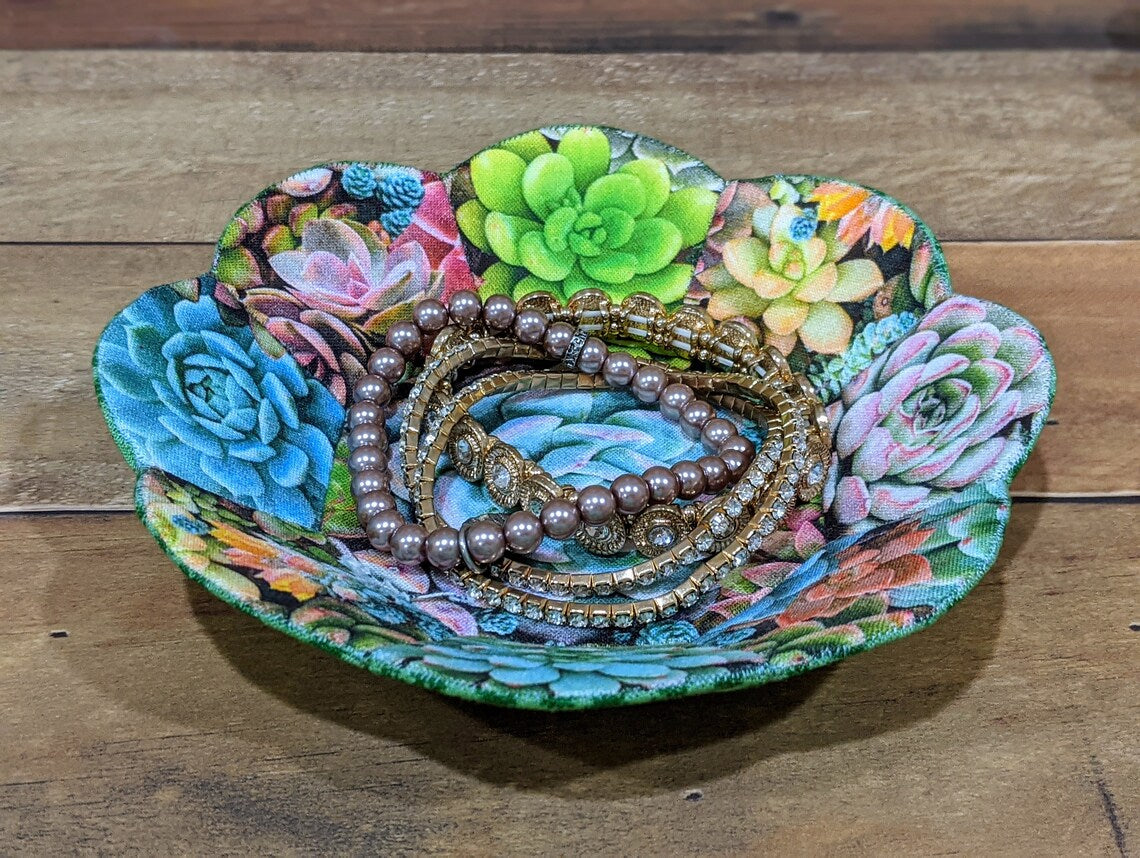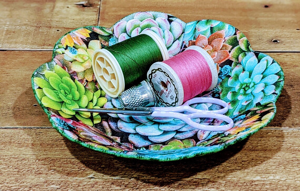 Description: Pretty Little Fabric Bowl Pattern. An ideal project to use up fabric scraps or showcase some of your favorite fabrics while making a handy little container as a gift or to sell at a craft or quilt market. This is a wonderful hand-stitching project that can be completed at your leisure.