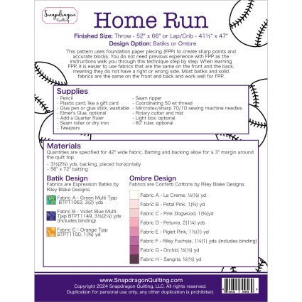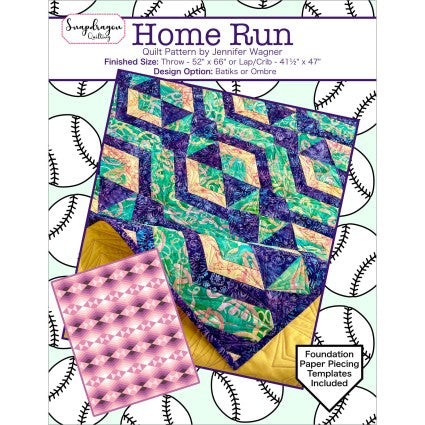 Description: Hit it out of the park with the Home Run Quilt Pattern! No prior experience with foundation paper piecing is needed. This pattern walks you through the technique step-by-step, guiding you around the bases and back to home plate. FPP papers are included to make either size project. Instructions are included for the two design options in batiks or an ombre. Great for confident beginners to advanced quilters.