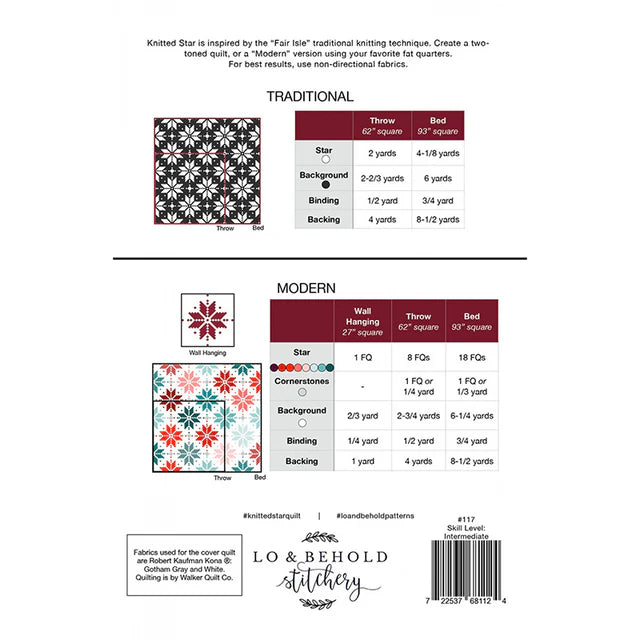 Description: Knitted Star is inspired by the "Fair Isle" traditional knitting technique. Create a two-toned quilt, or a "Modern" version using your favorite fat quarters. For best results, use non-directional fabrics. Pattern includes detailed instructions for strip piecing, as well as alternate color-way ideas, a coloring page to plan your quilt and more!