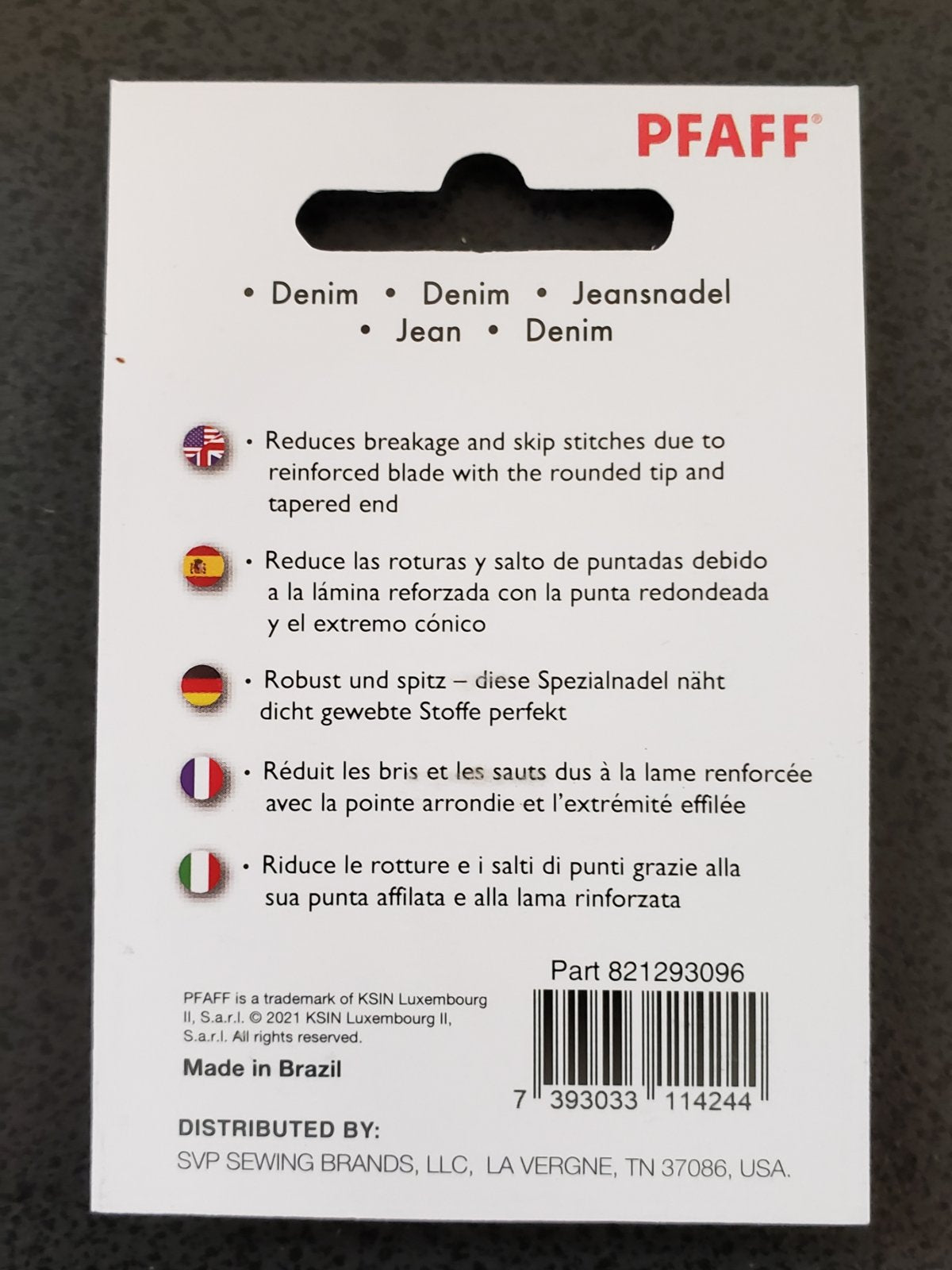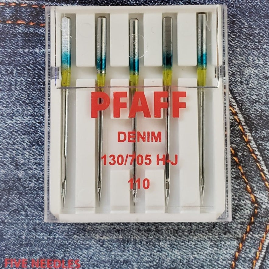 Description: Pfaff denim needles have a reinforced blade, rounded tip, and tapered end to reduce breakage and skipped stitches.