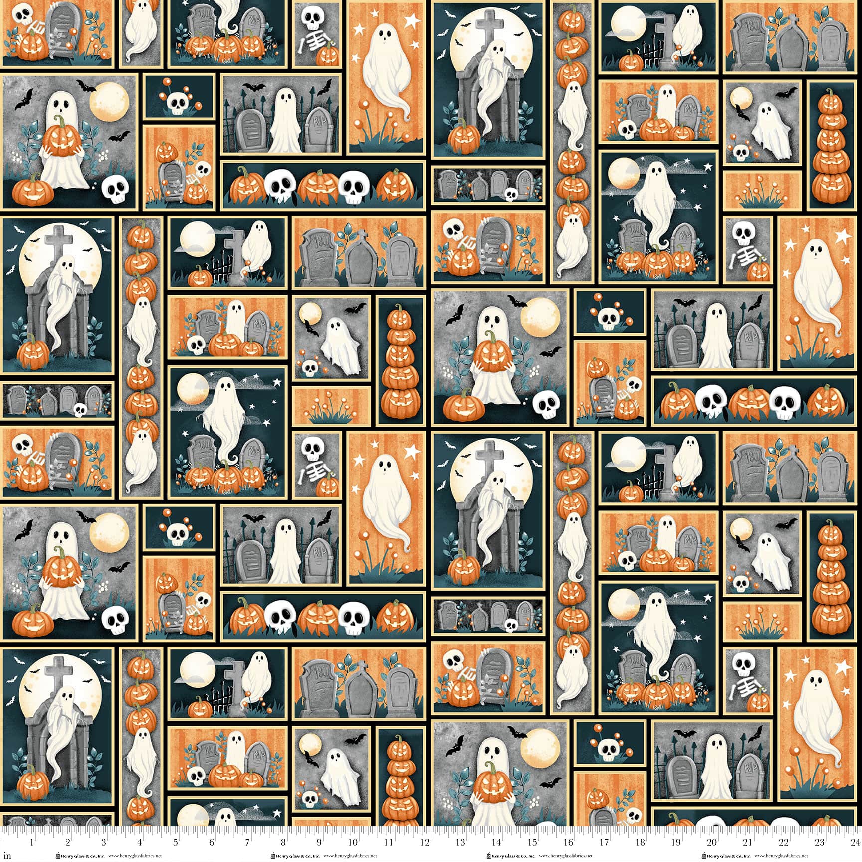 Collection Description: Ghosts in the Graveyard by Henry Glass Fabrics is a spooky-cute Halloween collection full of haunted fun! With friendly ghosts, glowing jack-o’-lanterns, creepy trees, bats, spiderwebs, and starry skies, these prints come in classic Halloween colors like orange, black, gray, and purple.