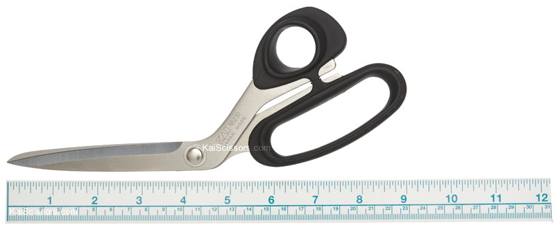 The Kai N5230 - 9" bent handle scissor has an ergonomically soft handle which allows for fatigue-free cutting on all types of fabric. It cuts multiple layers of denim with ease while trimming cottons without fabric slippage. It also features a tailoring bend for stand-up pattern cutting and for trimming batting from quilts.
