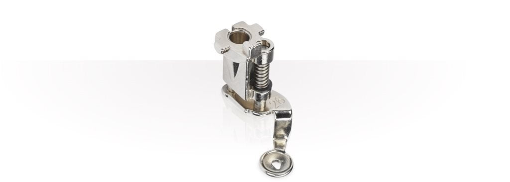 The #26L Embroidery Foot is used for free-motion stitching and as an alternative embroidery foot for embroidery machines. The “hoop” on the foot is longer at the front and back and angled upward to allow smoother movement over dense embroidery stitches.